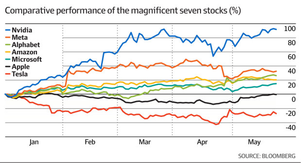 Nvidia’s journey to Wall Street royalty comes amid a divergence in the performance of the other magnificent seven stocks – Apple, Tesla, Microsoft, Alphabet, Meta Platform, and Amazon – which have largely fuelled the US sharemarket’s rally to record highs this year.